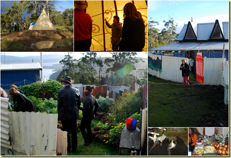 Outside we met Choco the goat, Audrey and Henry the geese and 2 talkative dogs. Theresa told us how well corrugated iron works to keep out possums, wallabies and other wildlife, while providing shelter from the wind, reflective heat and light for cold sensitive plants and a surface to cover with art!